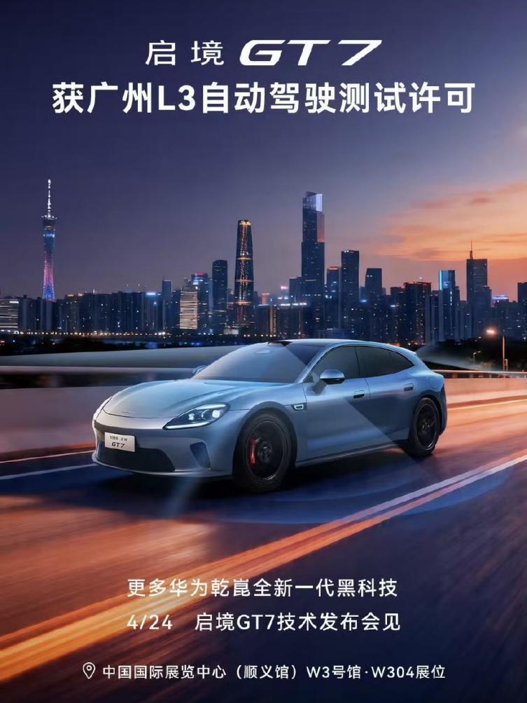 网通社快报 广汽与华为乾崑联合打造的启境GT7(测试车型:广汽AHC7000BEVW0D),正式获得L3级有条件自动驾驶道路测试许可,将在广州地区规定路段开展特定场景道路实测。